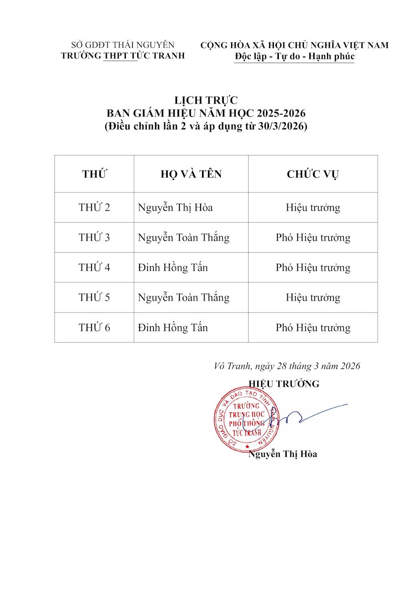Thông báo lịch trực của BGH trường THPT Tức Tranh Cập nhật: 28/03/2026 (14 lượt xem) Xem nội dung Tại đây Đăng bởi: thpt_tuctranh